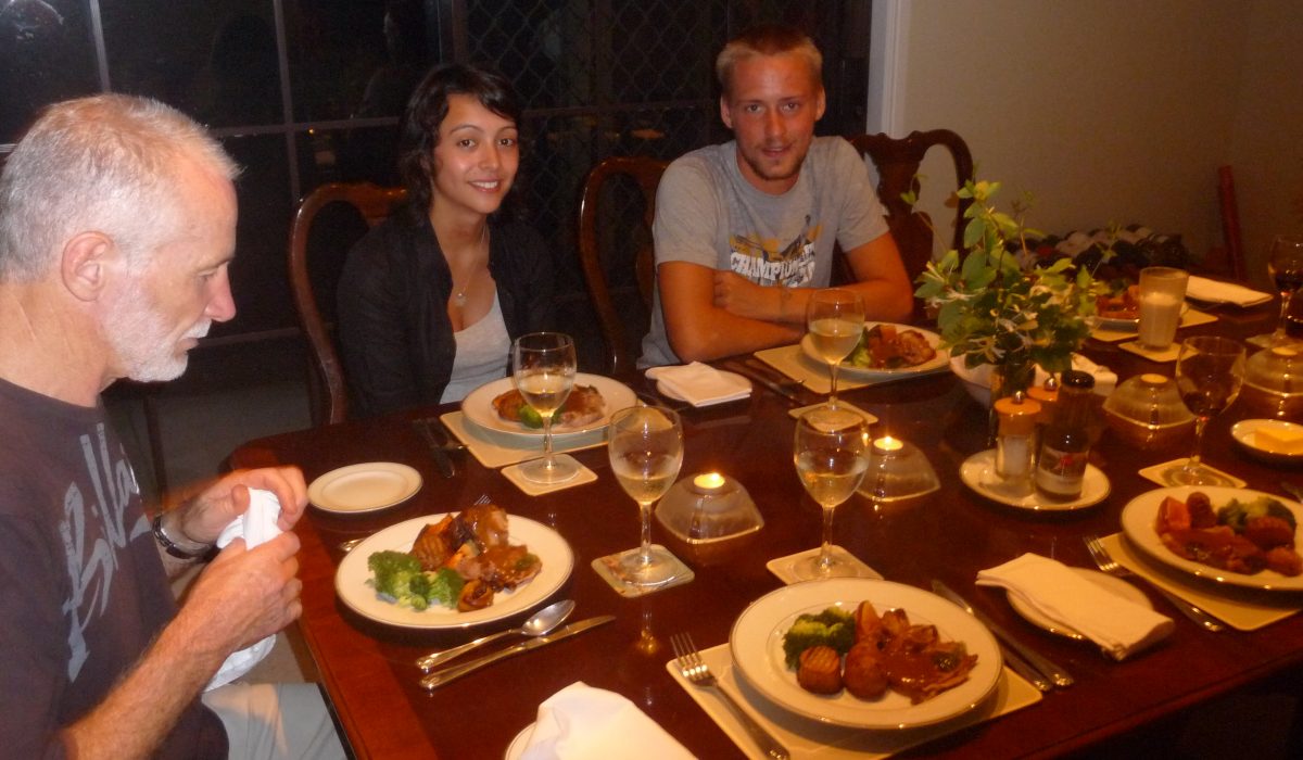 Nous arrivons donc dans cette famille, super sympa, pour partager 3 jours avec eux. Ils ont également invité un couple d’allemand, voyageurs comme nous. Nous sommes donc 8 à fêter le réveillon et ils nous gâtent avec un excellent repas…. Nous passons une super soirée dans l’arrière pays avec Greamme, Sally, Chris, Nick, Elena et Felix. Au menu, melon et jambon cru, roti d’agneau et petits légumes et christmas pudding, tout ça avec du bon vin néo zélandais….mmmm so delicious!! Il pleut averse dehors mais la chaleur humaine de nos hôtes réchauffe l’atmosphère.%name Day 123 : Christmas Eve.